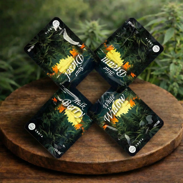 - Contents of large tasting set: 4x 5g with Blue Dream, Hulkberry, Sour Diesel, White Widow